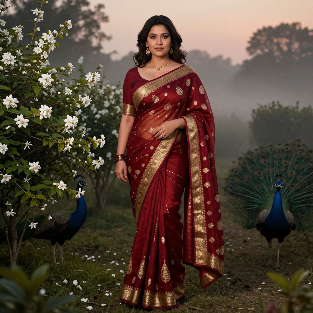 A cinematic-style photo of a woman with a round face, fair skin, and warm brown eyes in a full-length Krishna saree costume featuring a deep red base with golden borders and symbolic motifs, standing in a misty rural garden during twilight, with blossoming jasmine and peacocks nearby. The woman has big tits and cute face