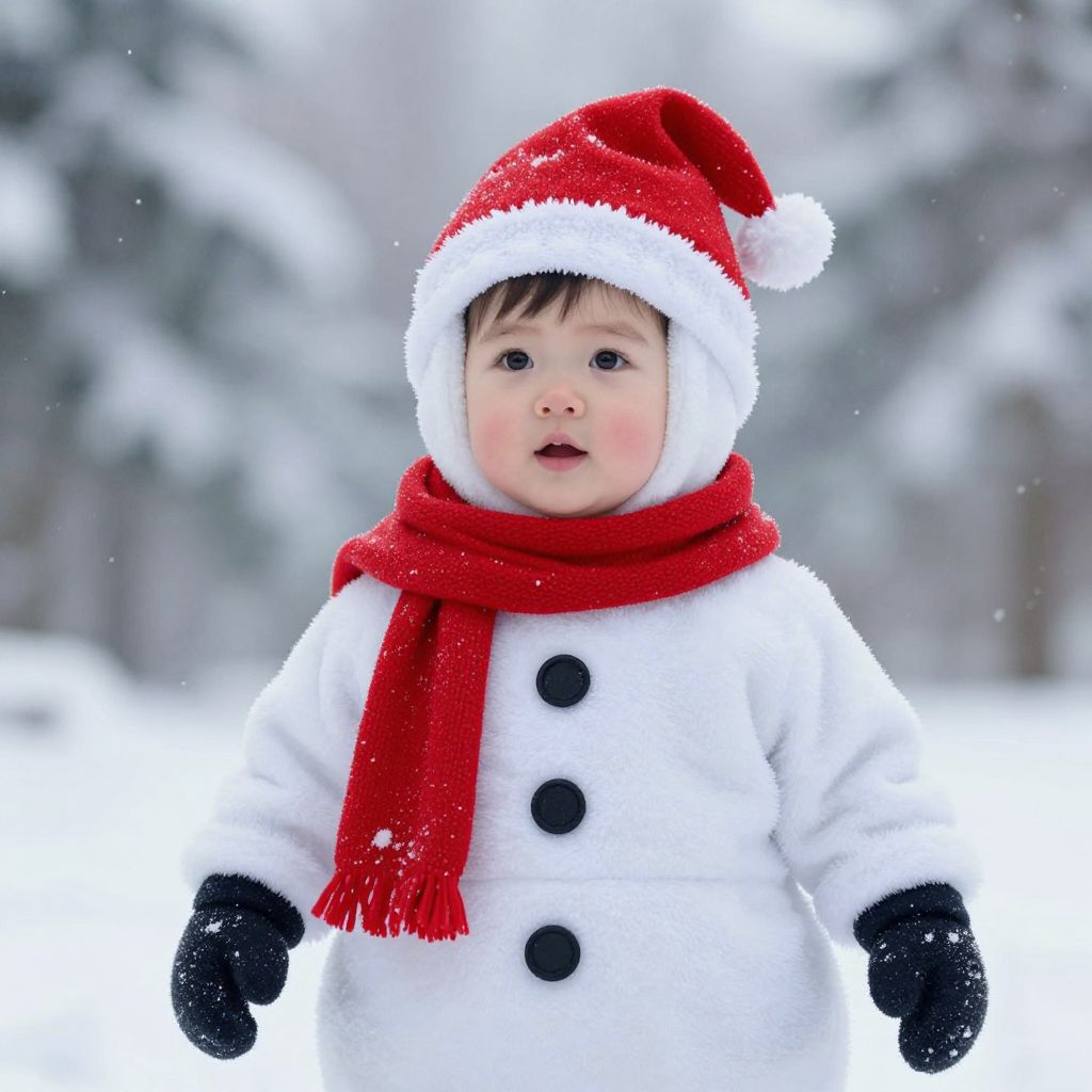 A cute, chubby little boy, perhaps four years old, dressed adorably in a classic snowman costume complete with attached black buttons, sporting a bright red scarf and a matching festive red hat, standing in a snowy, winter wonderland setting. Cinematic lighting, highly detailed, photorealistic.