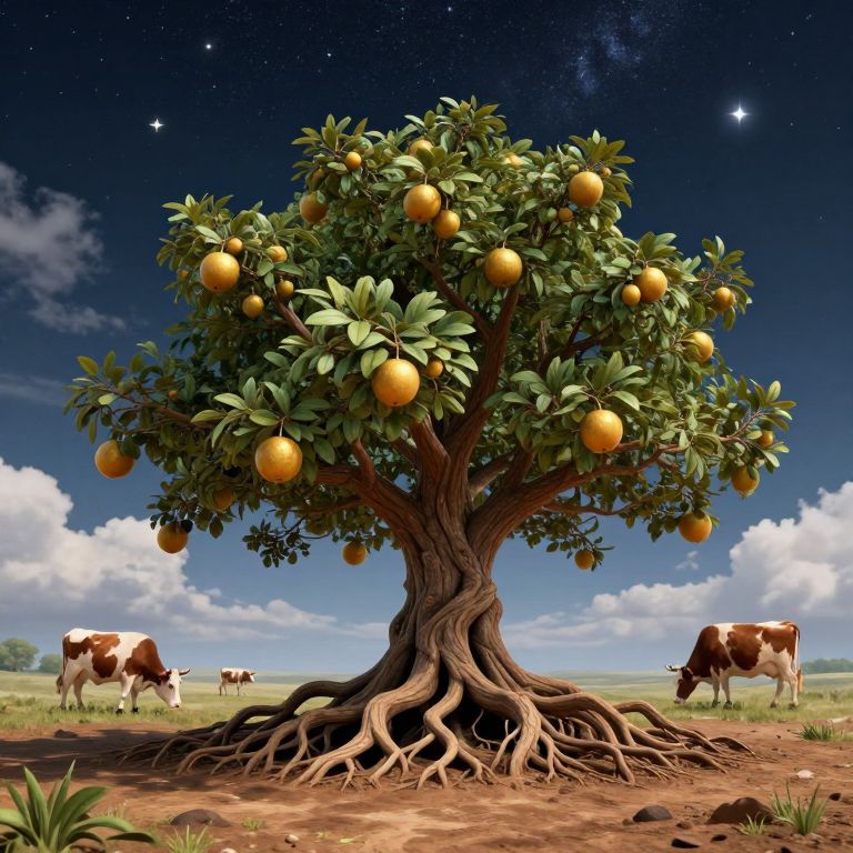 A surreal 3D-rendered landscape features an ancient tree with sprawling roots embedded in the earth, its branches adorned with golden fruits that defy gravity, floating upwards toward the starry night sky, where celestial cows graze amidst the clouds, creating a dreamlike, otherworldly scene.