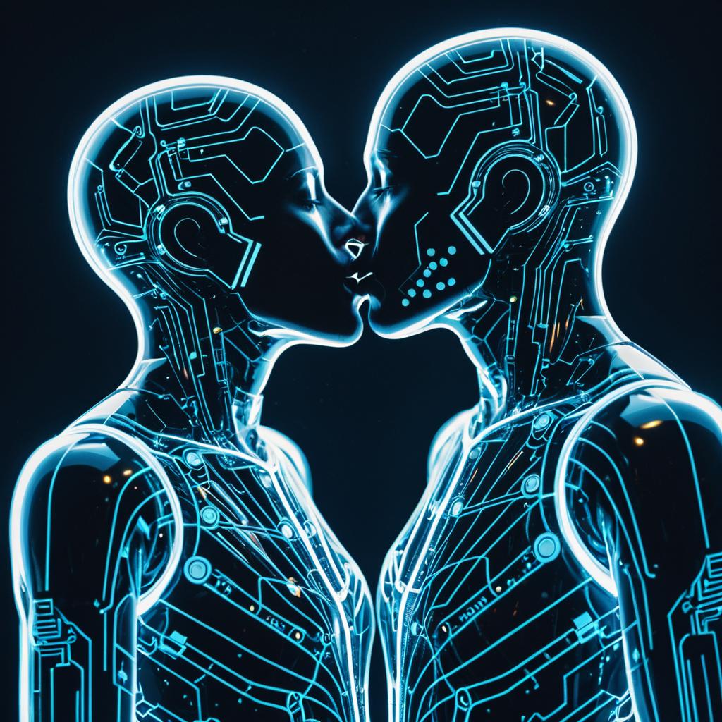 Portrait of two half-human, half-robot figures kissing, wearing leather jackets and neon goggles, in the style of Mark Ryden, James Gilleard, highly detailed