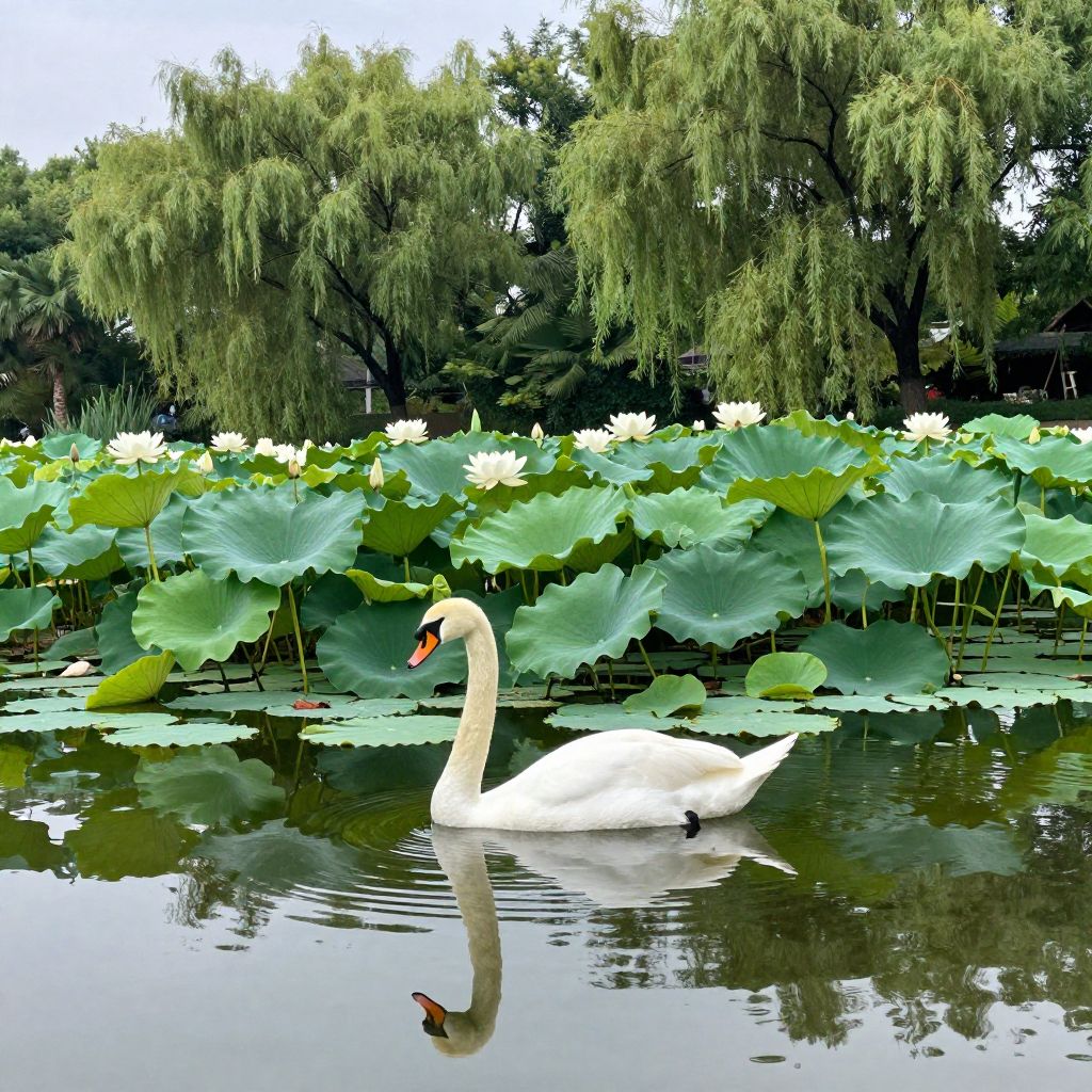 A graceful white swan glides across a calm pond surrounded by large green lily pads and blooming white lotus flowers. The serene water reflects the swan and surrounding lush greenery with tall weeping willow trees, creating a peaceful natural setting under a soft sky.