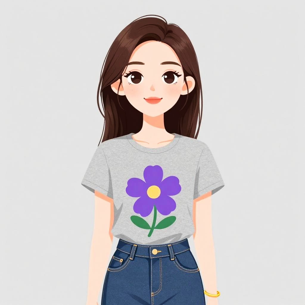 Woman with pretty face and pretty hair. Woman, casual, heather grey t-shirt with floral graphic, round neckline, short sleeves, blue denim jeans, visible pocket lining, gold bangle bracelet, straight brown hair over shoulders, neutral studio background --sref 1467