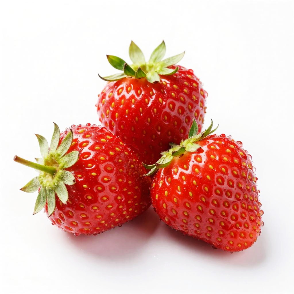 Photograph of three bright red strawberries with green stems and leafy tops. The strawberries are clustered together and covered in tiny water droplets, giving them a fresh and juicy appearance. Each strawberry has yellow seeds scattered across its surface. The background is a clean, white space, making the vibrant colors of the strawberries stand out prominently.