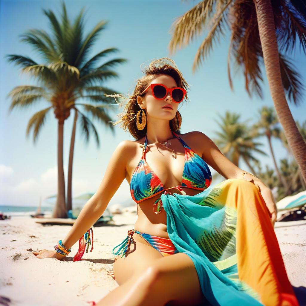 Sassy and trashy photograph of a carefree beachgoer, colorful bikini, sarong, oversized sunglasses, lounging on a sandy beach with palm trees, cinematic film still, Kodak Portra, chaotic and daring vibe.