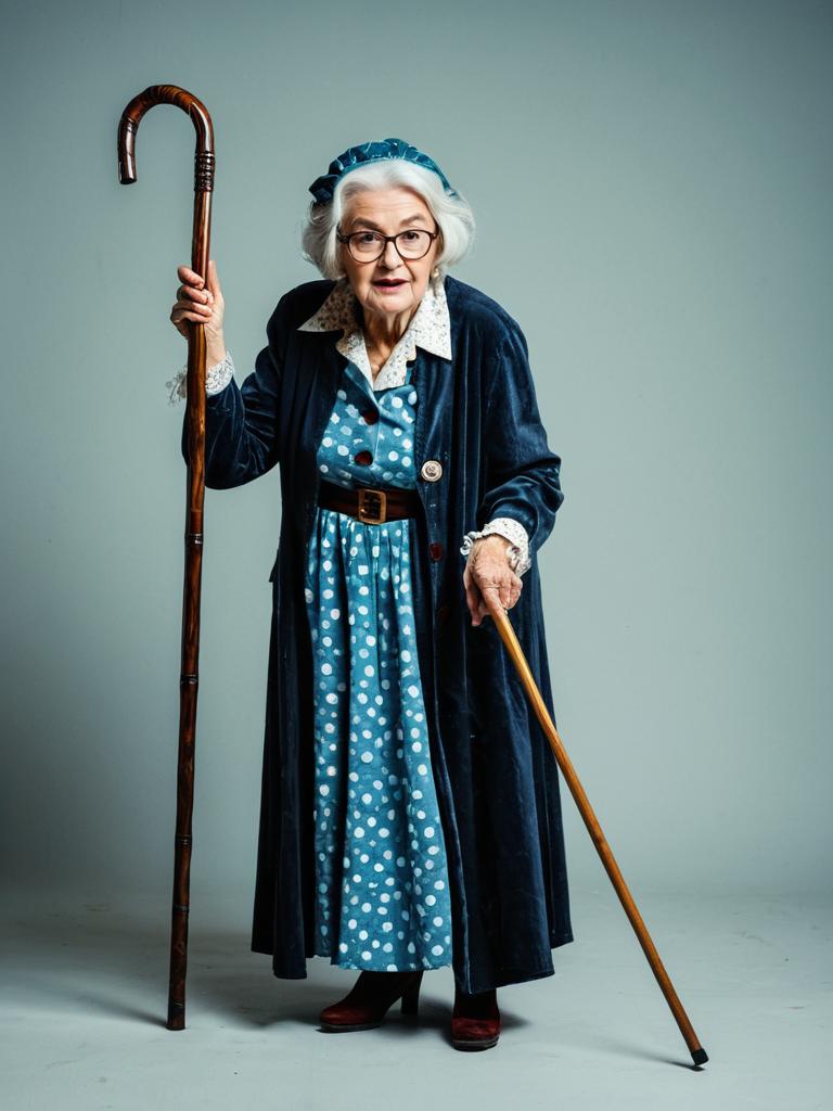 Woman in Crazy Old Lady Costume, full-body cosplay photo with cane
