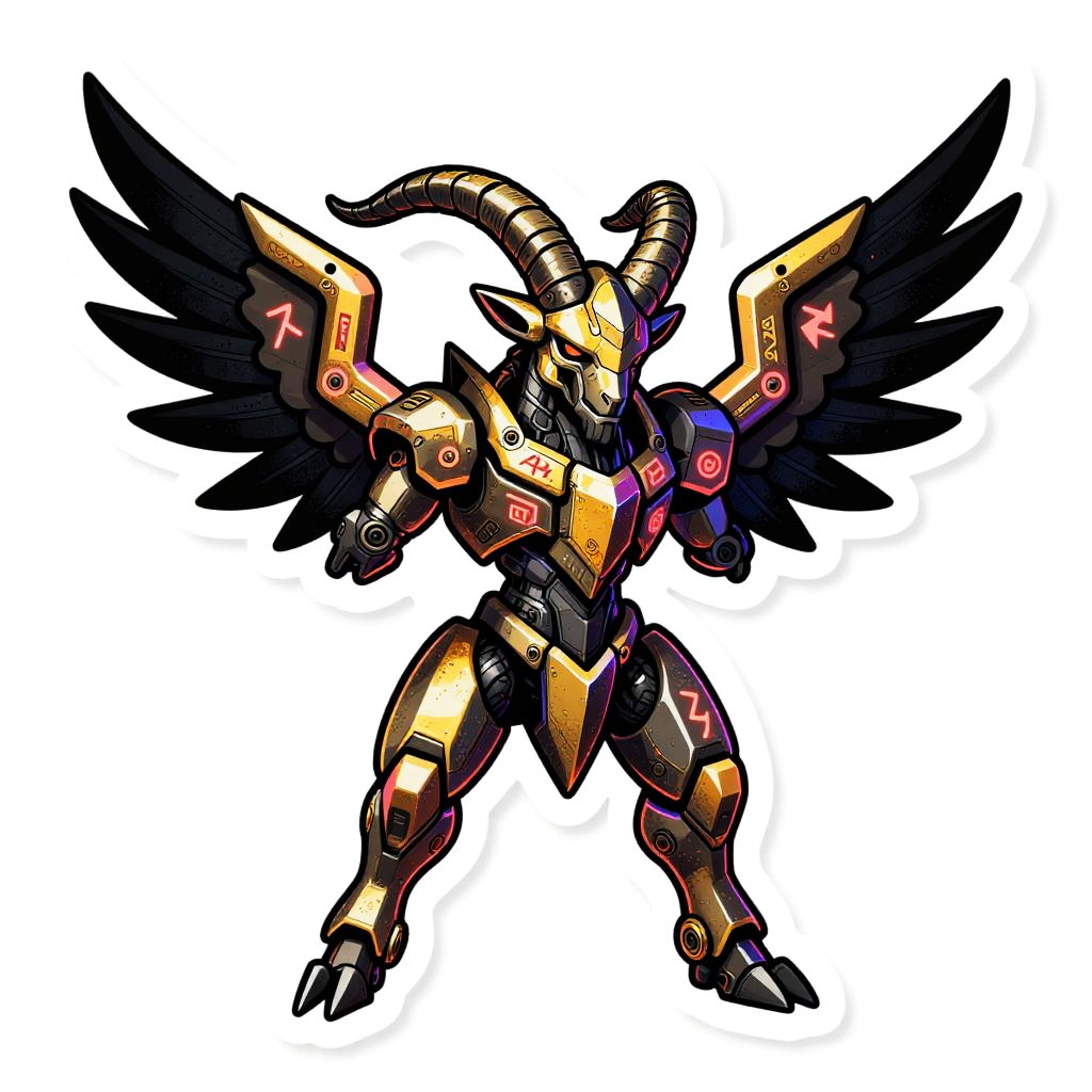 Digital illustration of a robotic, golden goat with black wings, horns, and intricate patterns, standing confidently against a white background.