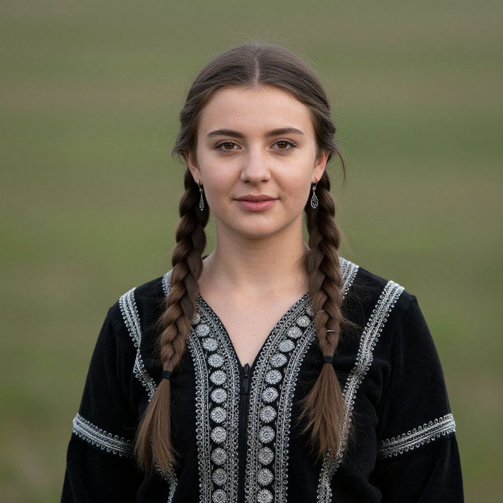 Photograph of a young woman with light skin and brown eyes, standing outdoors against a blurred green field. She has long brown hair styled in two braids and wears a black traditional embroidered blouse with white intricate patterns along the neckline and sleeves. She has a neutral expression, and her ears are adorned with small, simple earrings. The focus is on her from the waist up, highlighting her traditional attire and natural, minimal makeup look. The background is softly out of focus, emphasizing her as the central subject.