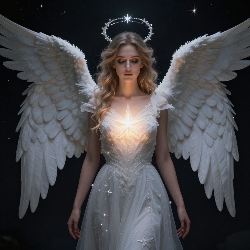 An angelic woman with detailed wings and a star, set against a dark, starry background.