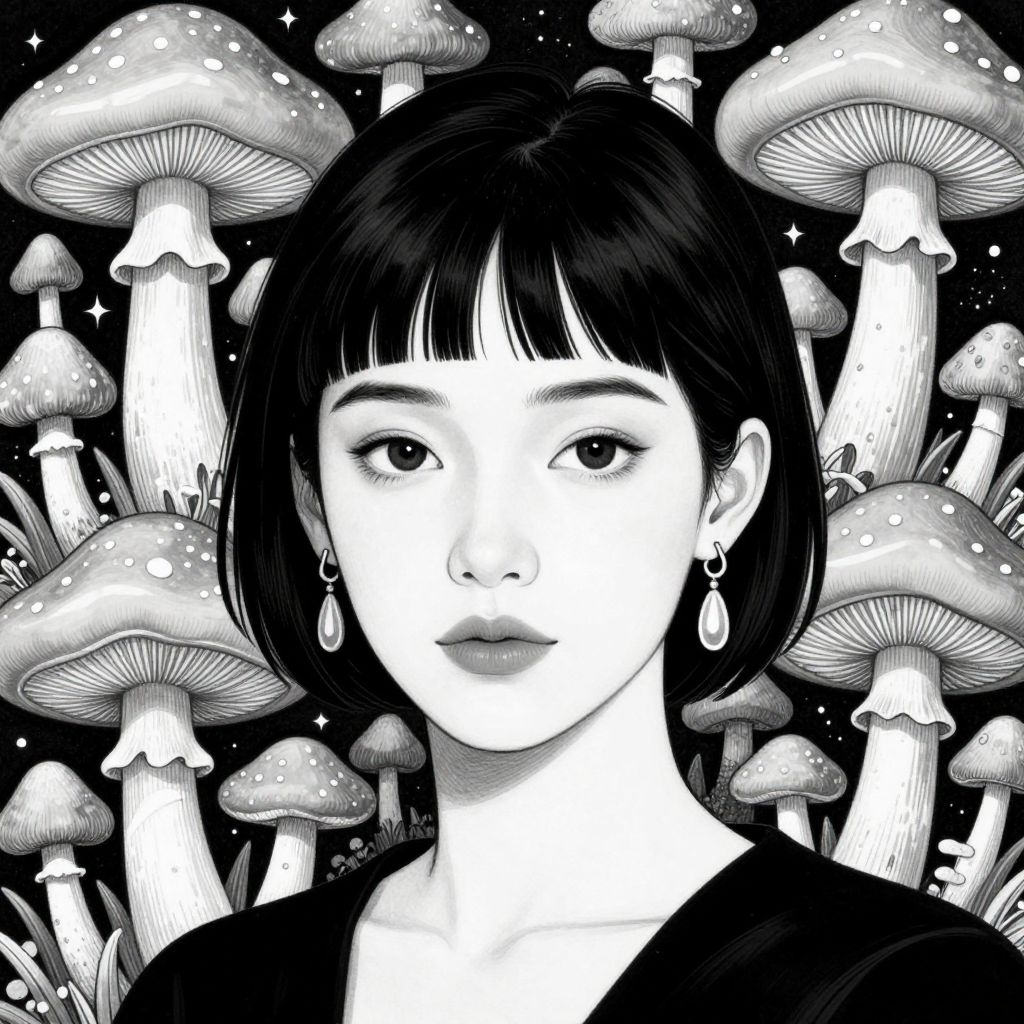 This is a black and white digital illustration of an Asian woman with short, straight black hair and blunt bangs, wearing small teardrop earrings. Her expression is neutral, with large, almond-shaped eyes looking directly at the viewer. She is surrounded by a dense forest of large, detailed mushrooms with textured caps and gills, set against a starry, night sky background. The mushrooms vary in size and are arranged randomly, creating a surreal, dreamlike atmosphere. The woman's face is centrally framed, and she wears a simple black top. The image has a highly stylized, manga-inspired aesthetic with strong contrast and clean lines.