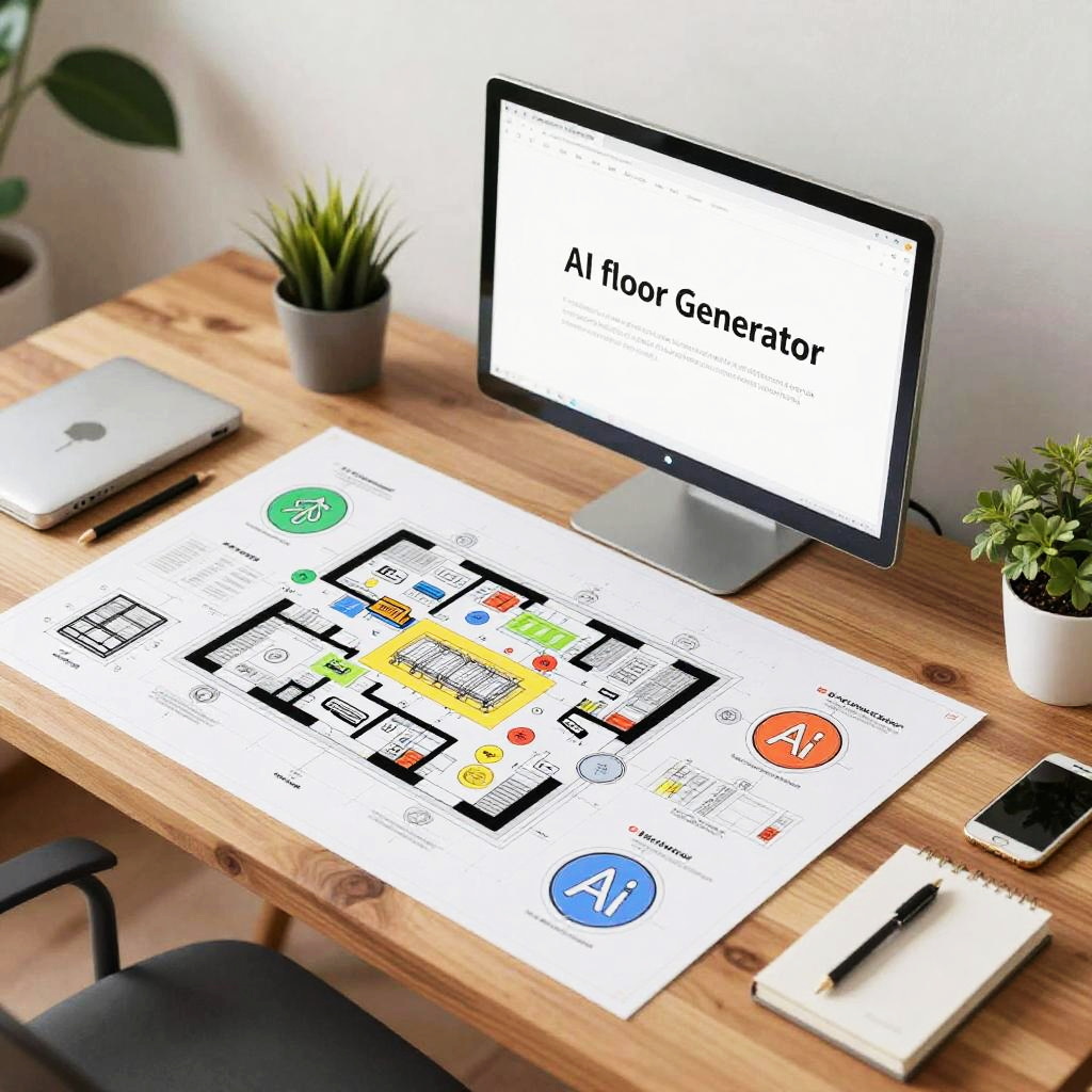 AI floorplan generator free software concept, vibrant digital blueprint overlay on a wooden table, technical drawings mixed with AI symbols, bright workspace with plants and gadgets, stylish modern architecture tools, high realism