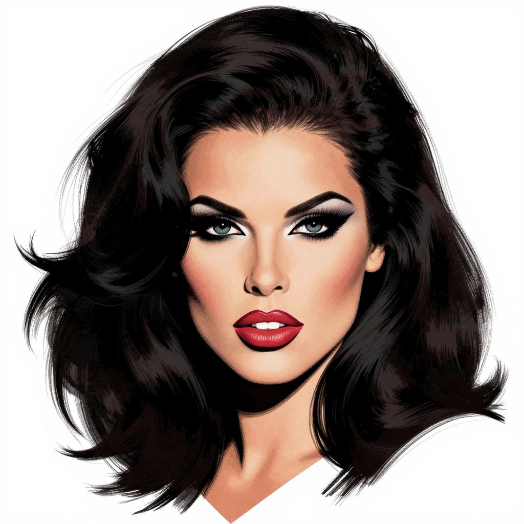 Digital illustration of a glamorous woman with voluminous black hair, bold red lipstick, dramatic black eyeliner, and white shirt, set against a plain white
