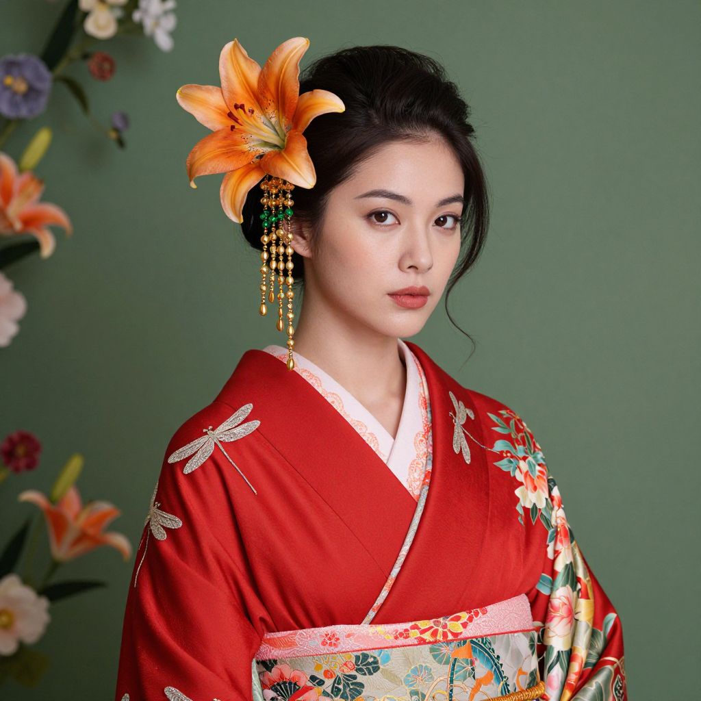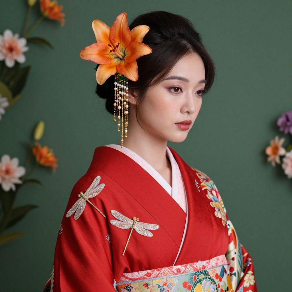 Photograph of an Asian woman in a red kimono with dragonfly embroidery, adorned with an orange lily hairpin, against a green background with