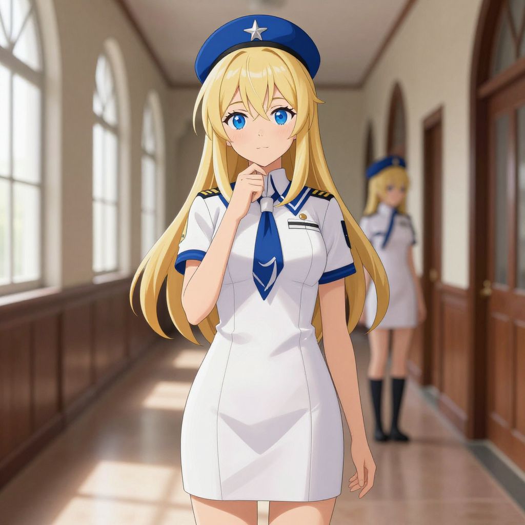 Digital anime-style drawing of a blonde woman with long hair in a white naval uniform with blue accents, standing in a sunlit, arched-window hallway. She has blue eyes, a blue beret with a star, and is touching her chin thoughtfully. Another similar character is in the background, slightly blurred. The floor is shiny, and the walls are dark wood panels.