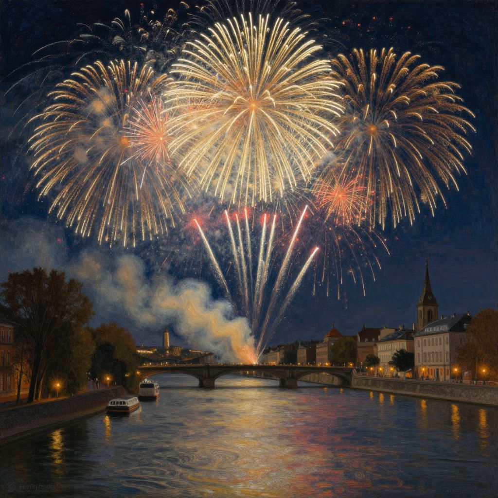 Photograph of a vibrant fireworks display over a river at night. Bright, colorful fireworks burst in the dark sky, casting reflections on the water below. A bridge spans the river, with buildings and a church spire visible on both sides. Smoke trails from some fireworks, adding a smoky texture. Boats are anchored on the left side of the river, and trees are silhouetted against the night sky. The scene is illuminated by the fireworks' glow, highlighting the celebration. The overall atmosphere is festive and lively.