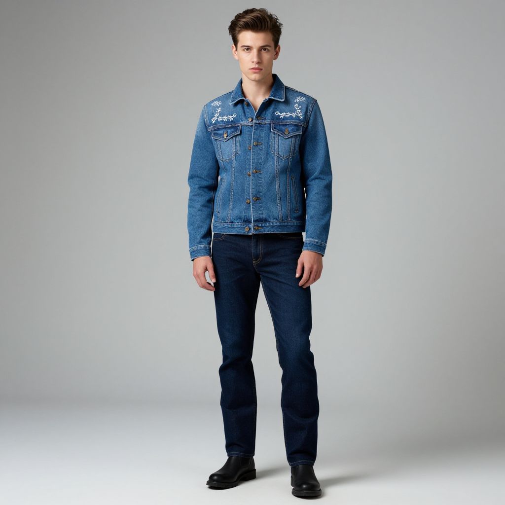 Photograph of a handsome, young Caucasian man with short, styled brown hair, standing against a plain gray background. He's wearing a blue denim jacket with white embroidery on the chest and shoulders, paired with dark blue jeans and black boots. The jacket has a slightly fitted cut and buttoned pockets, while his jeans are straight-legged. He looks confidently at the camera with a neutral expression.