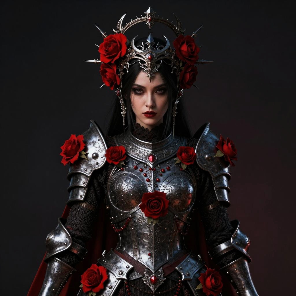 A fierce woman wearing highly detailed gothic armor decorated with red roses and intricate engravings. She stands confidently against a dark background, crowned with an elaborate metal headpiece featuring large red flowers and ornamental spikes. The armor includes shoulder plates and gauntlets with matching gothic design elements, embodying a dark fantasy aesthetic in a highly realistic digital art style.