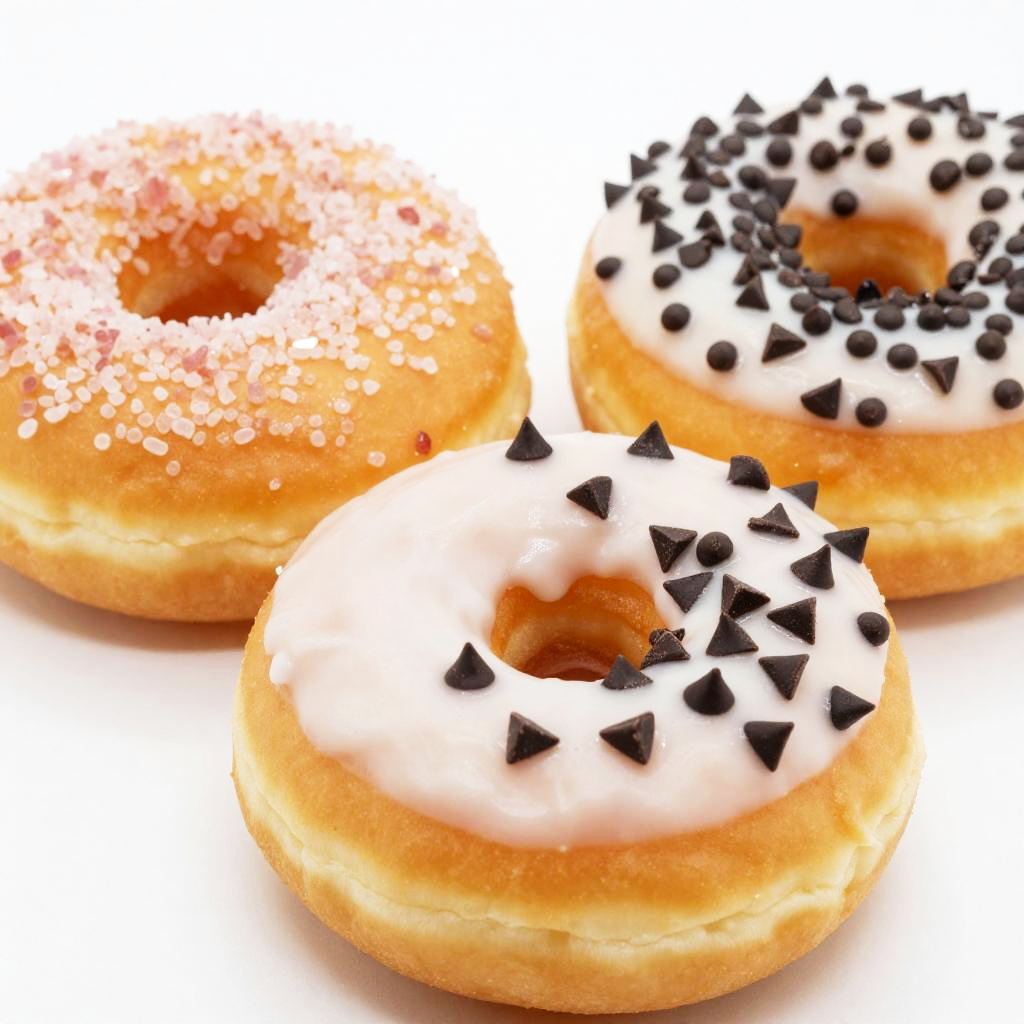 Photograph of three glazed donuts with different toppings. The donut in the foreground has a white glaze with black triangular sprinkles. The donut to the left has a white glaze with pink sugar sprinkles. The donut in the background has a white glaze with black round sprinkles. All donuts have a golden-yellow, slightly shiny texture. The white background highlights the colorful toppings, creating a bright and appetizing visual. The close-up shot emphasizes the donuts' smooth surfaces and sugary textures.