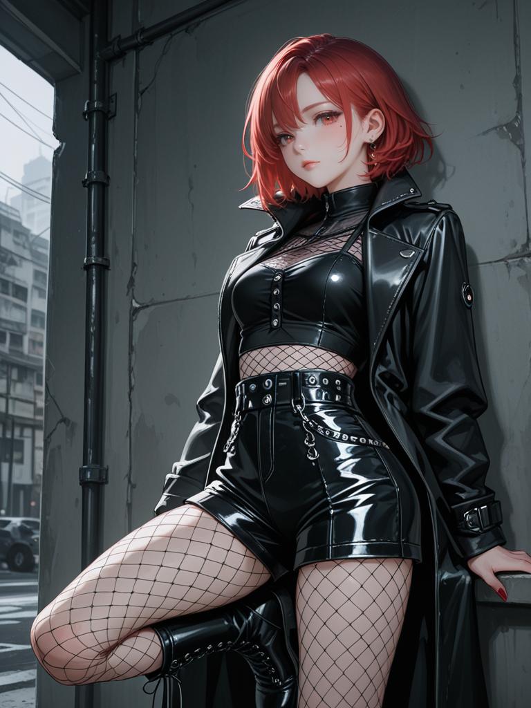 1girl, realistic face, Edgy fishnet top, cropped design, black nylon, long sleeves, layered over a fitted trench coat, metallic silver vinyl, asymmetrical hem, snap button closure, high collar, paired with high-waisted faux leather shorts, deep red, studded details, knee-high lace-up combat boots, matte black, rugged sole.