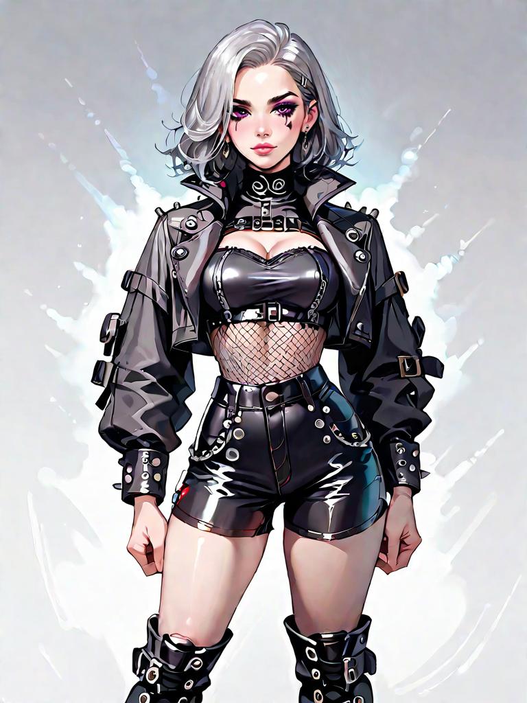 Digital artwork of a young woman with silver hair wearing an edgy fashion ensemble featuring a black nylon fishnet crop top layered over a fitted trench coat with an asymmetrical hem and snap button closure. She has high-waisted faux leather shorts with studded details and knee-high lace-up combat boots in matte black. The realistic face is complemented by bold makeup with purple eyeshadow and black teardrop accents. The overall look is punk-inspired with metallic and rugged elements.