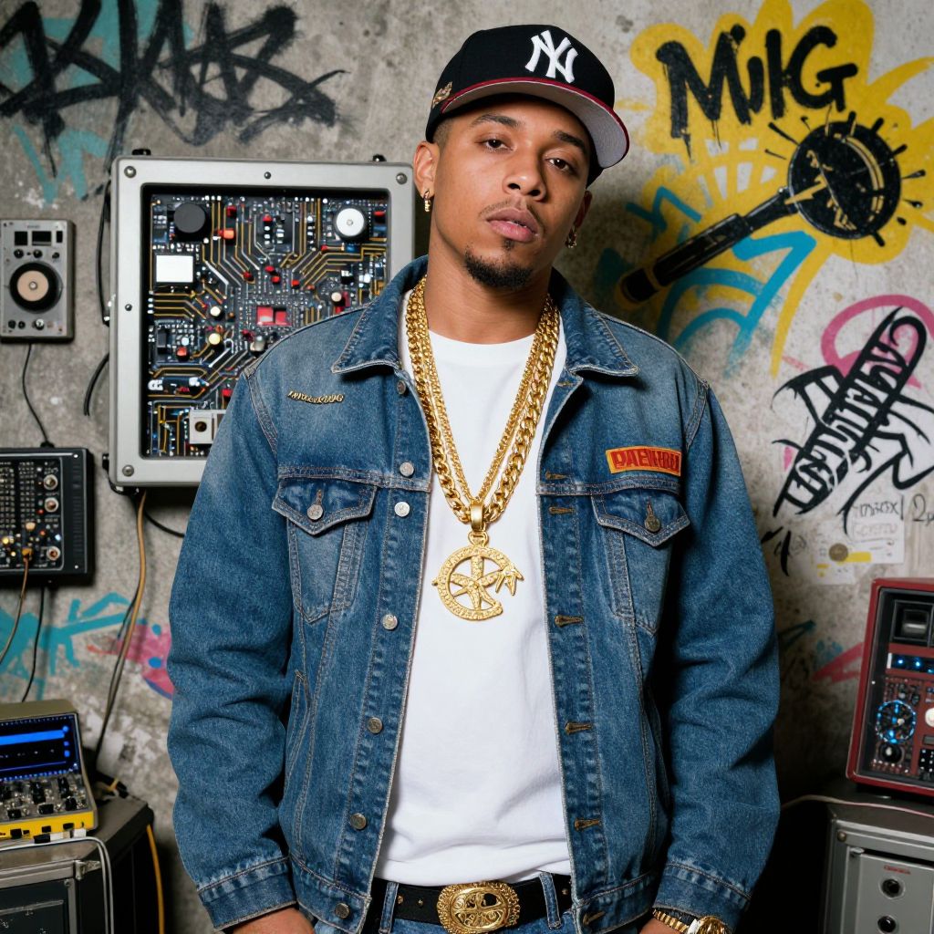 A hyperrealistic portrait of a man dressed in 80s hip hop clothing, adorned with gold chains and surrounded by electronic components, stands against a cluttered wall with street art and circuitry, painted by Artgerm.