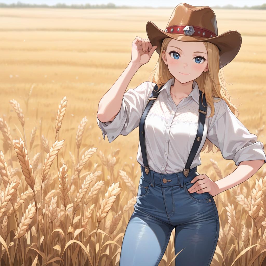 (masterpiece, best quality:1.2), cowboy shot, solo, 1girl, freckles, smile, looking at viewer, hand on hip, blonde hair, cowboy hat, blue eyes, naked suspenders, topless, jeans, wheat field