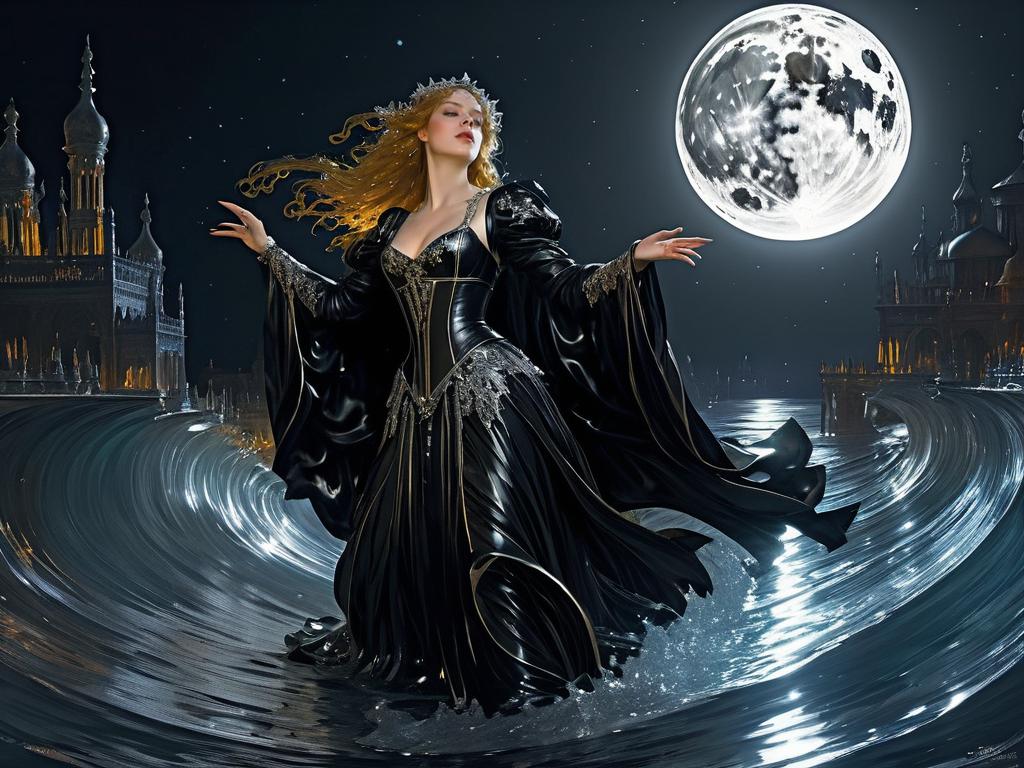 Beneath the moonlight glints a tiny fragment of silver, a fraction of a line... black robes, falling ... blood spills out in litres, and someone screams a word. artstation, intricate details, hyper details, by gaston bussiere and sandro botticelli