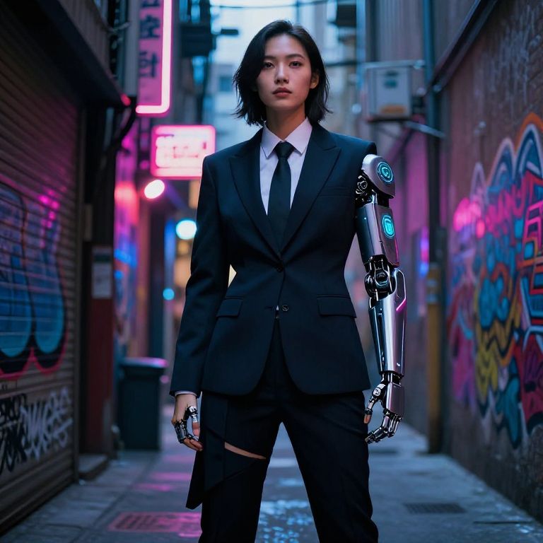 Cyberpunk business suit with asymmetric cuts, integrated tech gadgets glowing softly, paired with a sleek cybernetic arm, posing confidently in a dimly lit alley filled with neon graffiti, showcasing the intersection of business professionalism and a cyber-enhanced world.