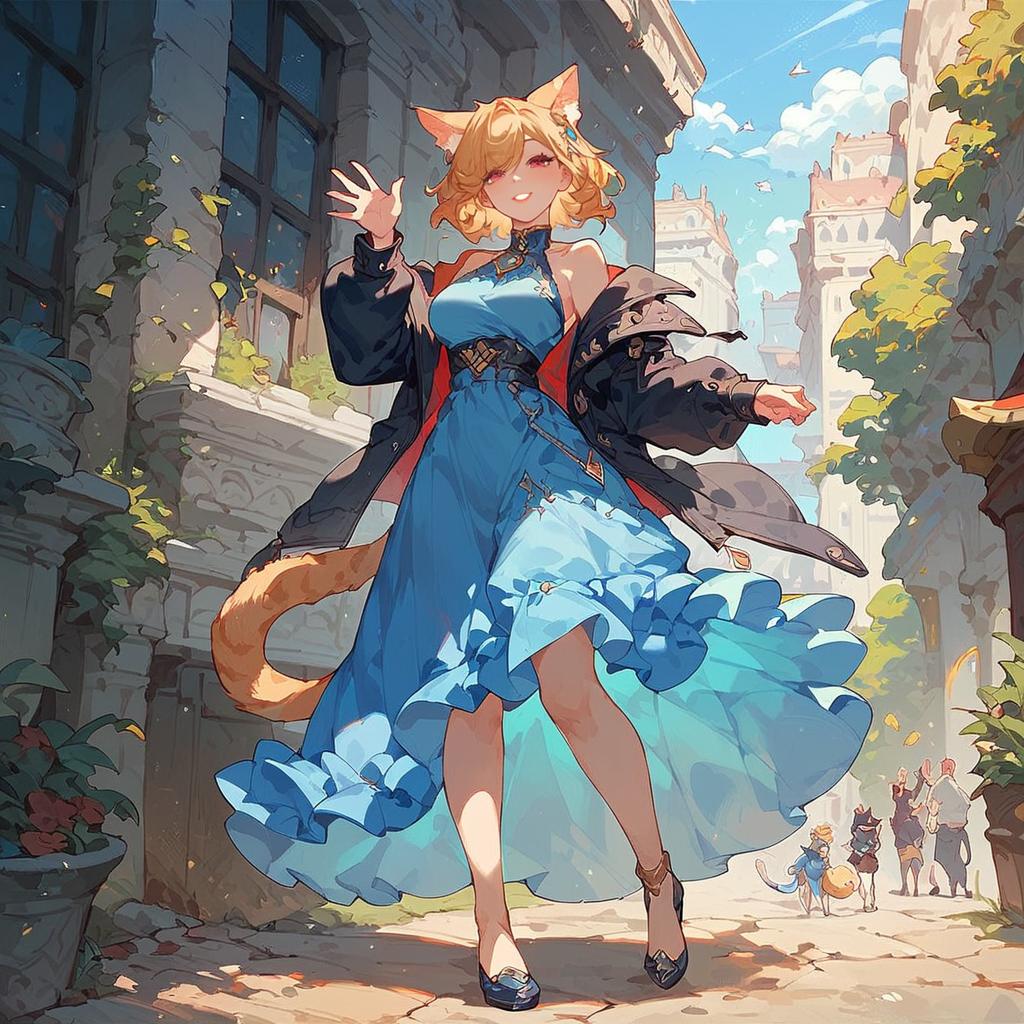 Digital illustration of a cat girl with blonde hair, cat ears, and tail, wearing a flowing blue dress and a loose black jacket. She is waving with a cheerful expression while standing in a sunlit city street surrounded by classical architecture and green foliage.