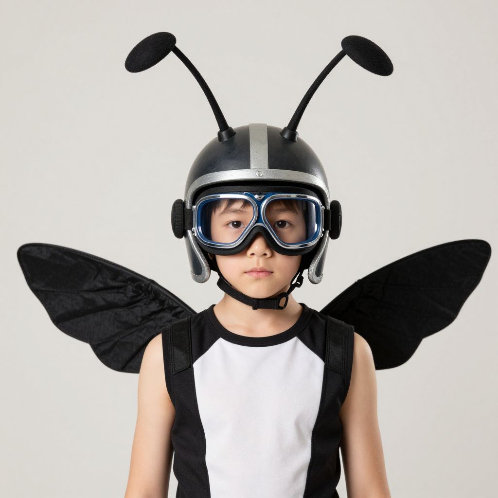 Fly movie costume, 1boy, male focus, solo, goggles, looking at viewer, helmet, upper body, antennae, wings, simple background