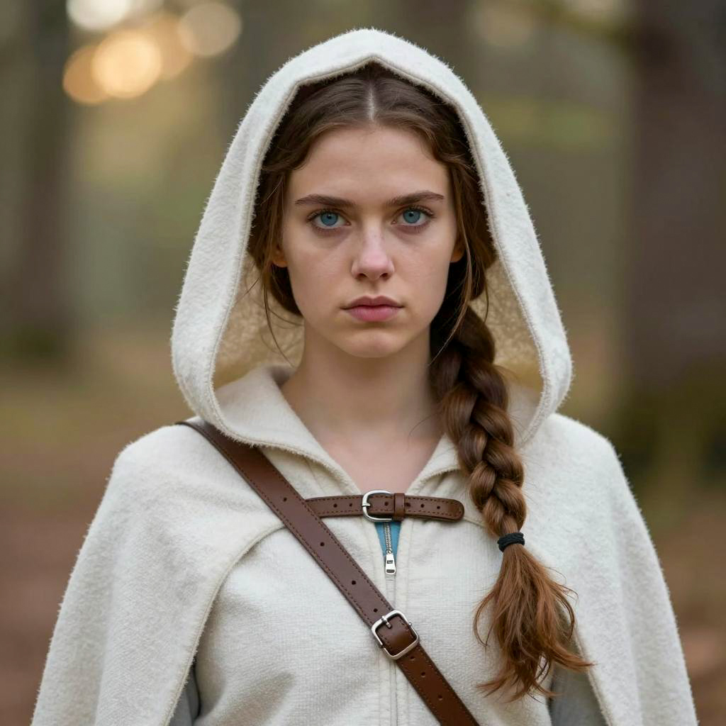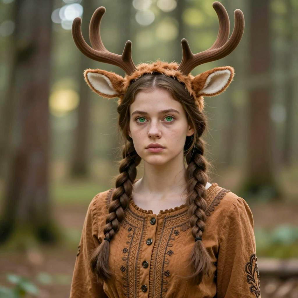 Fawn costume girl, photorealistic portrait of a young woman with green eyes, wearing a deer costume headpiece with antlers and large ears, brown braided hair, brown long-sleeve dress with intricate pattern and buttons, outdoors in a forest with sunlight filtering through trees, soft focus background, serious expression, realistic lighting, detailed ures, realistic CGI, natural colors
