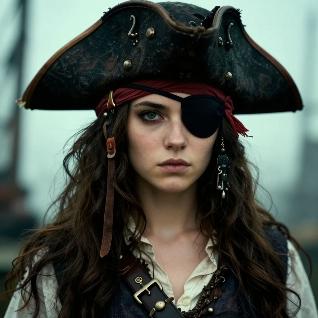Photograph of a young woman with long, dark brown hair, wearing a large, dark brown, 18th-century-style pirate hat adorned with gold buttons. She has an eyepatch covering her right eye and wears a white, slightly unbuttoned shirt with a brown leather vest. A gold chain with a cross pendant hangs around her neck. Her expression is neutral, with slightly parted lips. The background is plain white, emphasizing her pirate-themed attire. The image has a realistic, high-contrast style.