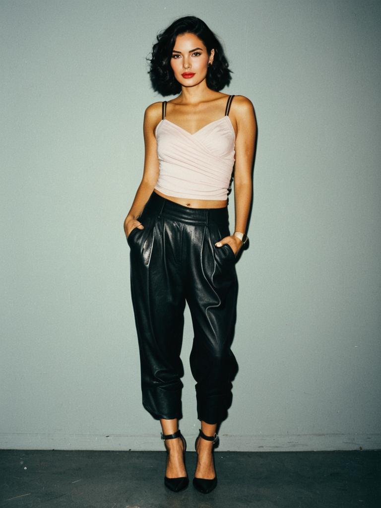 Woman, urban casual, black cropped tank top, high-waisted printed leggings with a muted camouflage pattern, ankle-high black boots with a slight heel, plain background with a gradient from light to dark. --sref 1399
