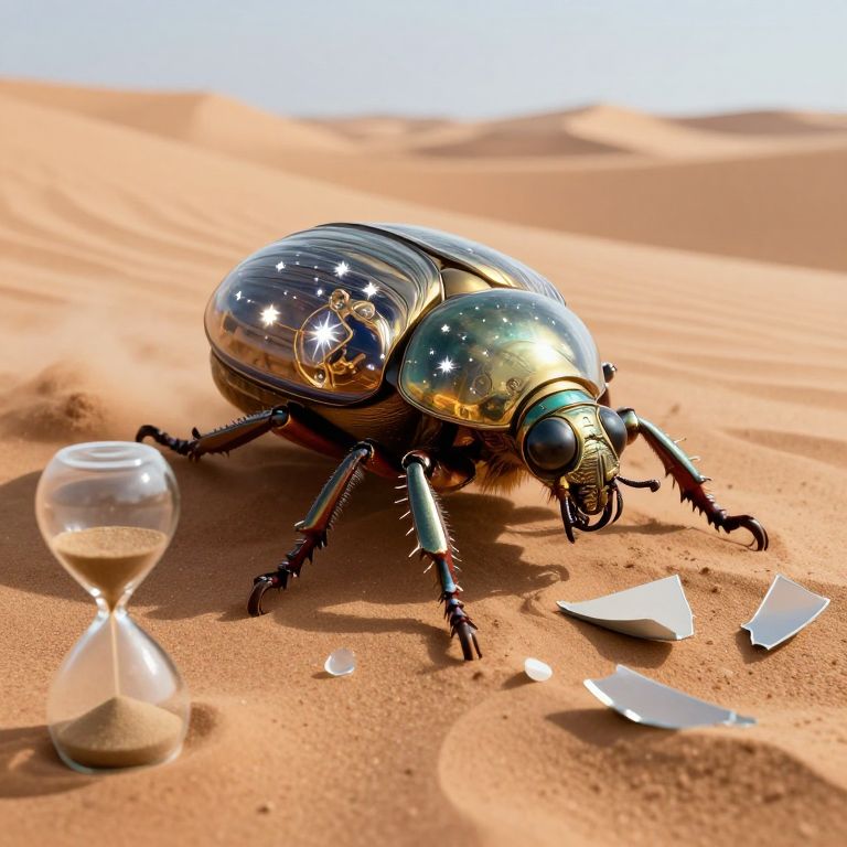 Photorealistic CGI of a reflective, metallic beetle with star-like reflections on its shell, standing on golden sand with an hourglass and scattered paper fragments