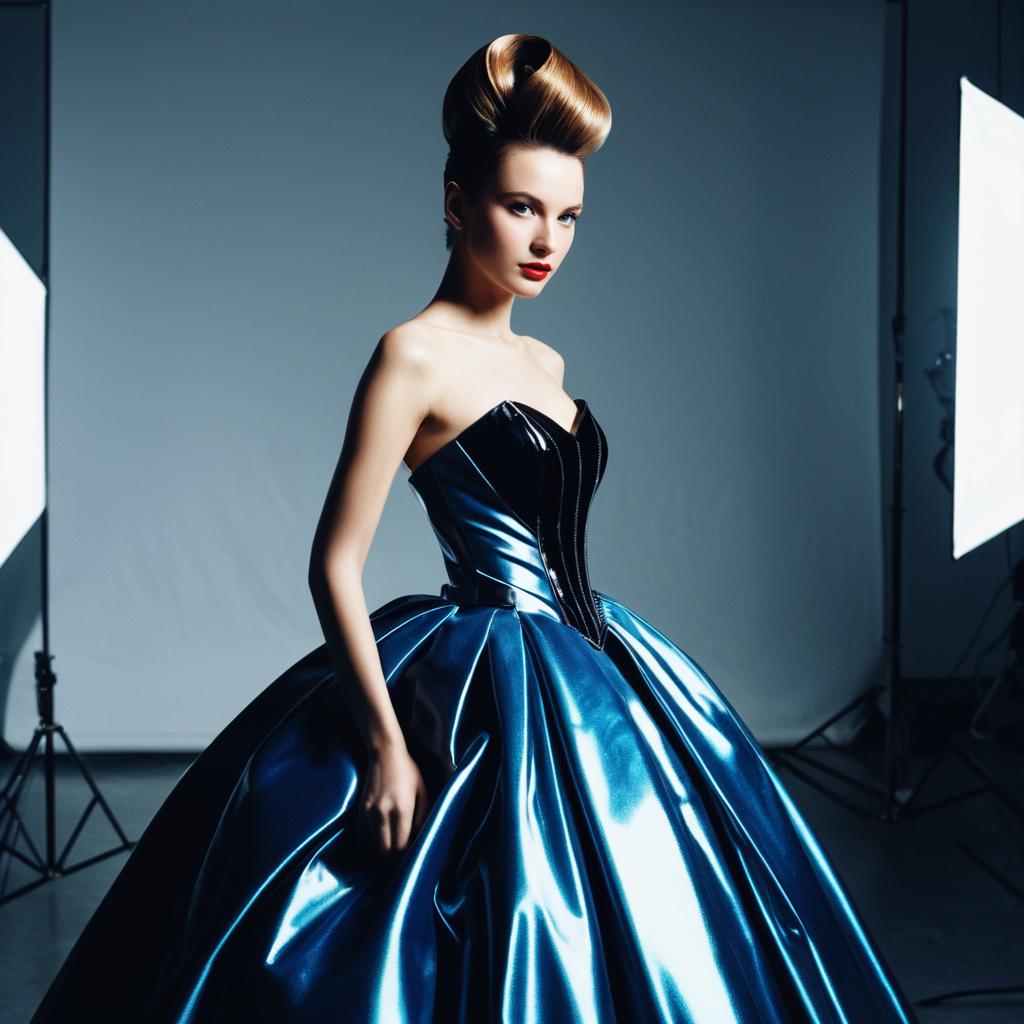 Portrait of a fashion model with spiral curly hairstyle wearing a layered, deep blue elegant gown. The photo is taken in a studio setting with professional spotlight highlighting the model, emphasizing the texture of the dress and the details of the hairstyle.