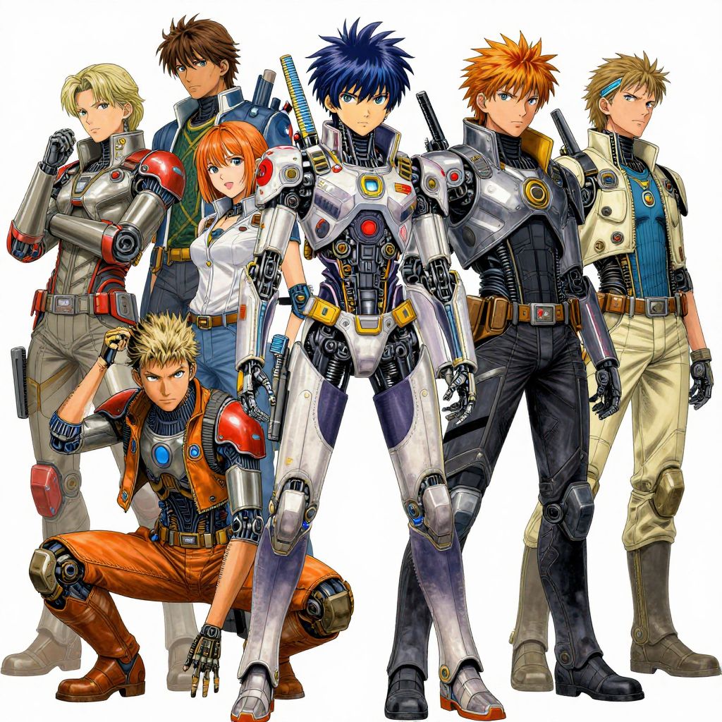 Science fiction military science fiction, a world where people can teleport to different locations, a time traveler's mission to save humanity, the art style features highly intricate linework with a focus on mechanical details and futuristic elements, blending human and robotic components seamlessly, The color palette emphasizes bold, contrasting tones like neon blues, yellows, and reds against softer backgrounds, creating a dynamic and vibrant aesthetic, Characters are depicted with a mix of realism and stylized anime features, often showcasing high-tech armor, cybernetic enhancements, and expressive poses, The overall style evokes a gritty yet polished sci-fi world, balancing technological sophistication with artistic flair