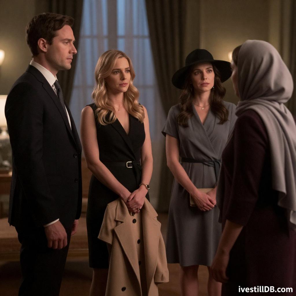 Photograph of four people in a dimly lit room. A man in a black suit stands left, a blonde woman in a black dress holds a beige coat in the center, a woman in a gray dress and hat stands right, and a woman with a gray headscarf faces them. Background includes a window and blurred lights. "MoviestillsDB.com" in the bottom right.