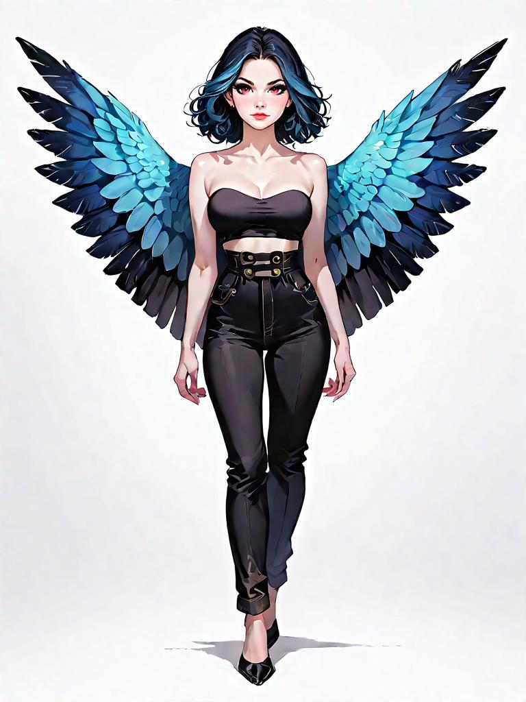 1girl, source_comics, realistic face, full body shot, Woman, chic, black strapless crop top with a plunging sweetheart neckline, fitted high-waist black pants, minimalist design, subtle metallic accent on neckline.
