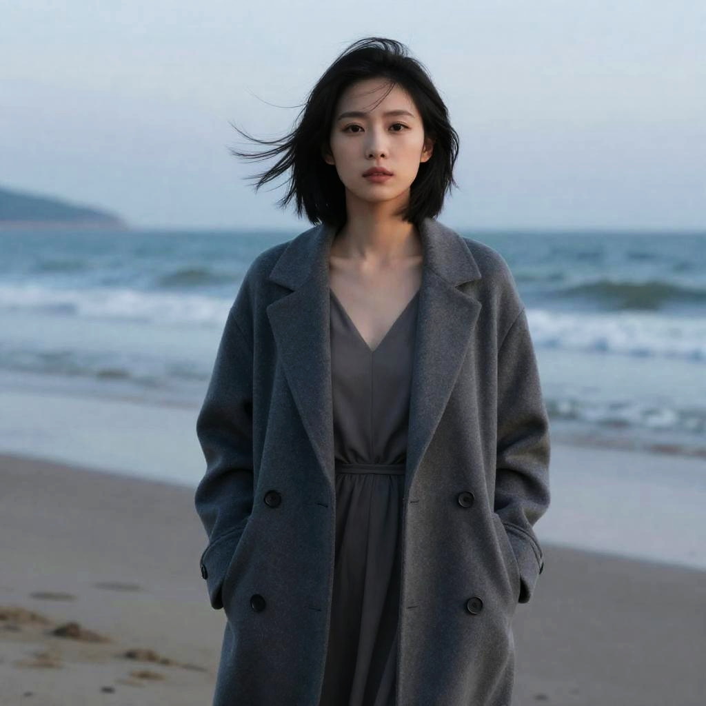 Photograph of an East Asian woman with medium-length black hair standing on a beach at dusk. She wears a long, dark gray, double-breasted coat over a matching dress with a V-neck. Her hands are in her coat pockets, and she gazes directly at the camera with a neutral expression. The background features a blurred ocean with gentle waves and a faint horizon line under a cloudy, blue-gray sky. The sandy beach is visible in the foreground, with some scattered seaweed. The overall mood is calm and slightly melancholic.