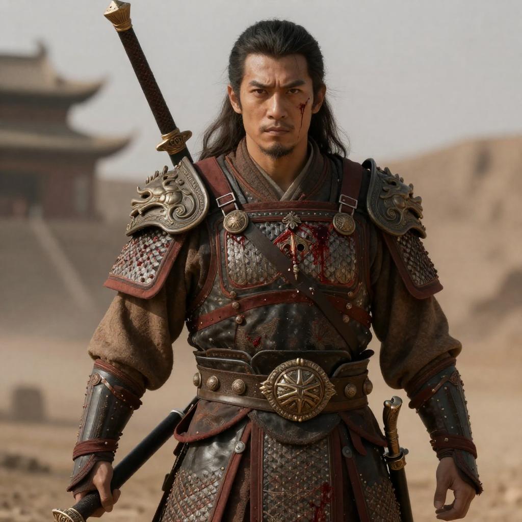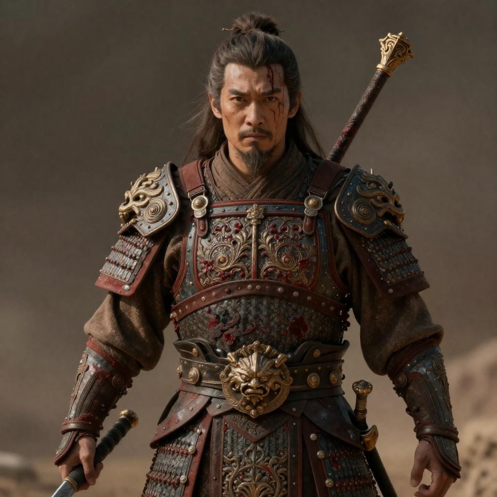 A hyper-realistic portrait of an ancient Asian warrior dressed in intricately detailed armor with dragon motifs and blood-red accents. The warrior stands in a focused and intense stance holding a staff, displaying battle scars on his face. The armor features ornate metalwork and studded embellishments, designed with warm earthy tones and exceptional sharpness.