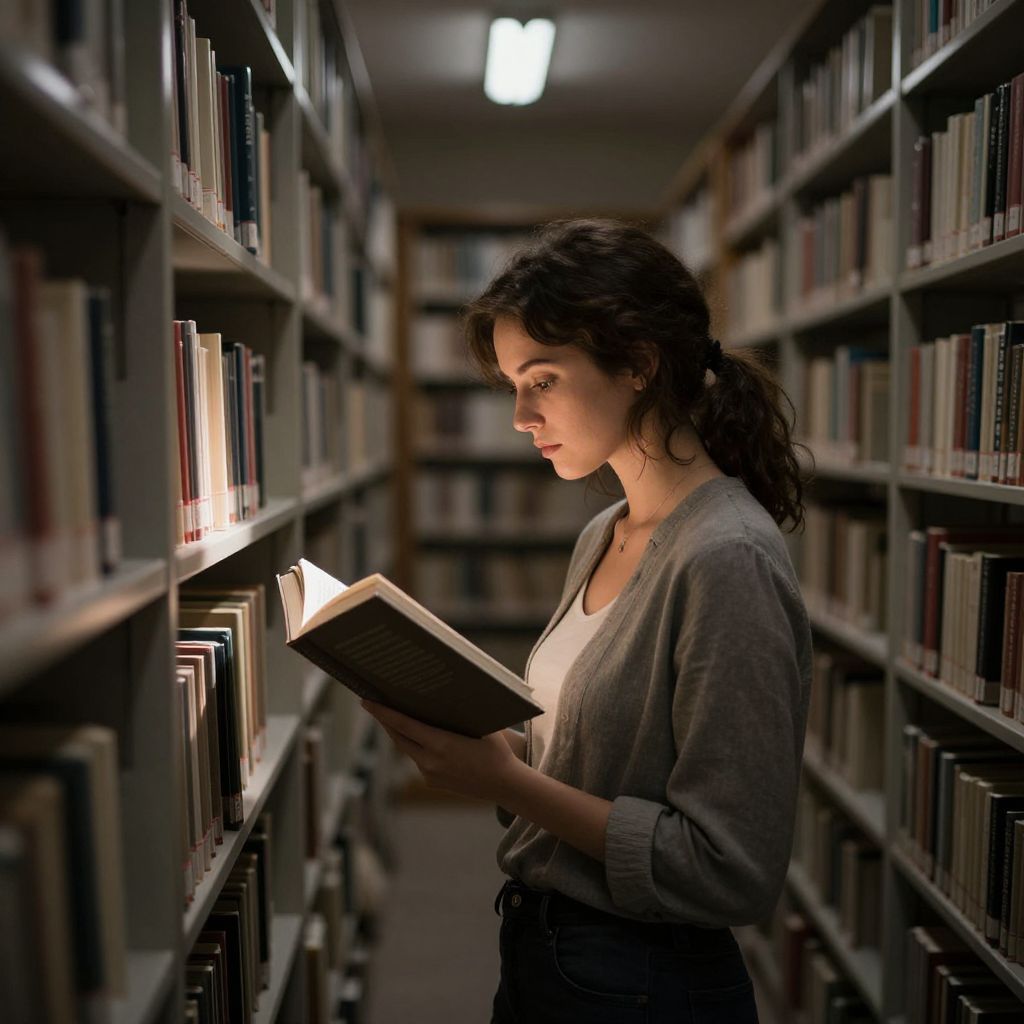 Woman engrossed in reading a book amidst rows of meticulously organized shelves in a dimly lit library, her focused gaze illuminated by soft overhead light casting ethereal shadows around her.