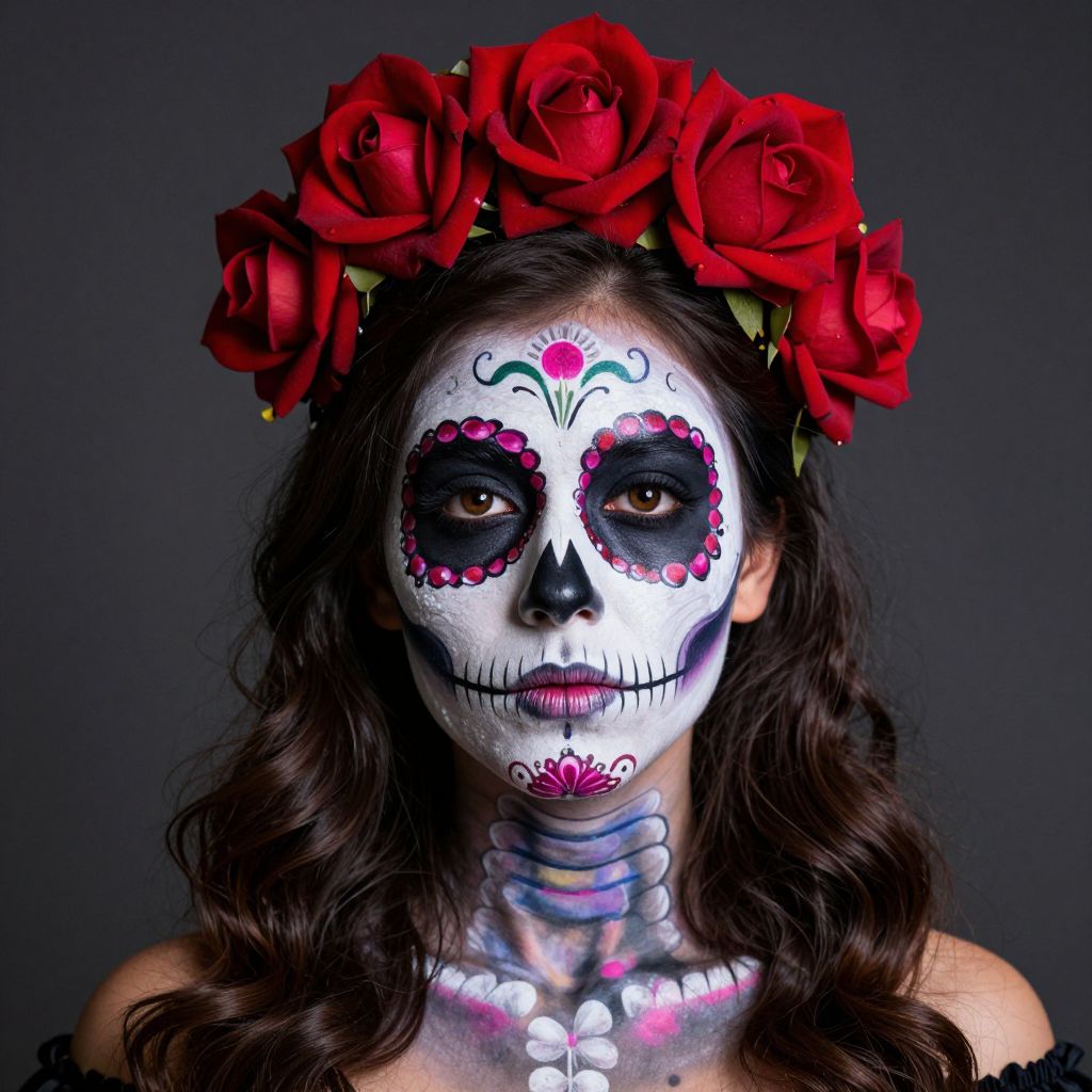A woman adorned with a surreal sugar skull makeup transforms into a living canvas of fantasy, her face painted as a vibrant calavera, crowned by a halo of crimson roses that seem to defy gravity.