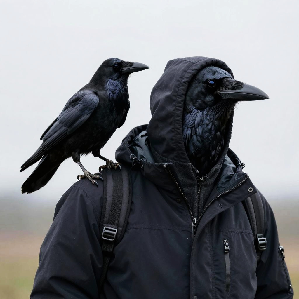 Black Crow, dressed in a hooded jacket and a raven on his shoulder
