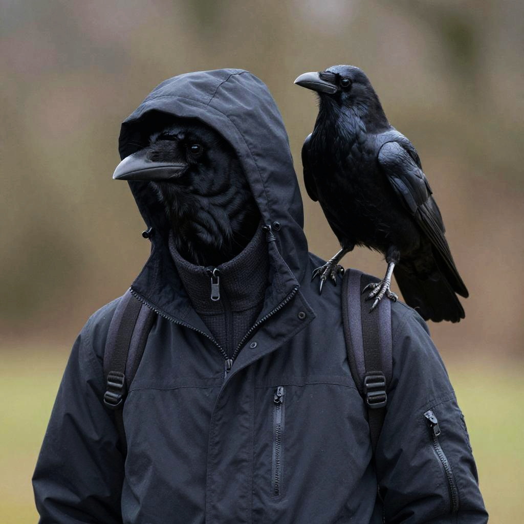 Photograph of a person in a black, hooded, waterproof jacket with two black crows perched on their shoulders. The person's face is not visible, and they wear a backpack. The crows have glossy black feathers and sharp beaks, with one crow facing forward and the other slightly to the side. The background is a blurred, overcast sky with faint hints of green and brown, suggesting an outdoor setting. The image has a high contrast, emphasizing the dark colors and textures of the crows and jacket against the pale sky.