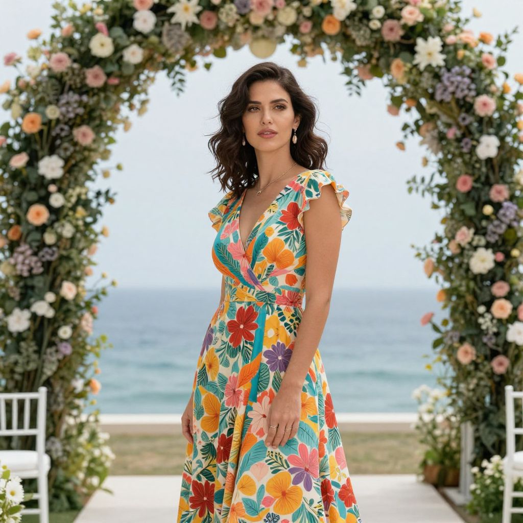 A woman with shoulder-length wavy hair wearing a colorful floral dress poses elegantly against a backdrop of flower-covered arches and a serene ocean view.