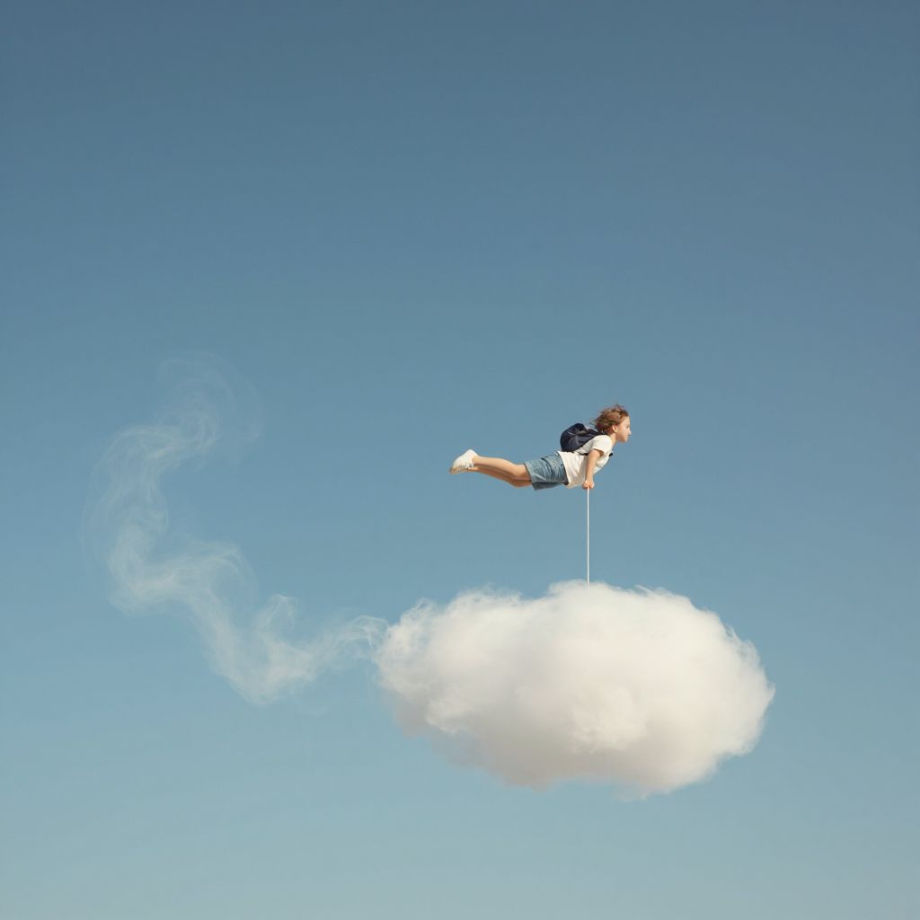 A child soars through the sky, tethered to a whimsical cloud that trails ethereal wisps of smoke, defying gravity in a dreamlike flight of imagination.