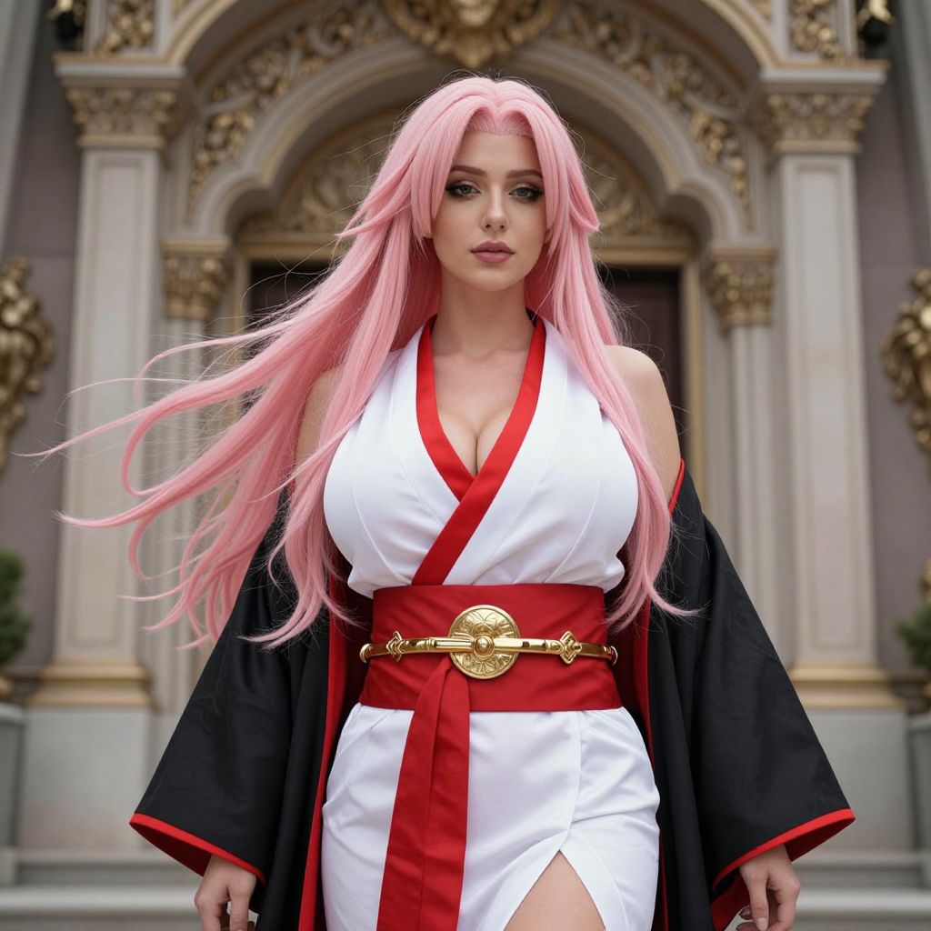A beautiful, sexy woman with long, flowing pink hair, featuring big tits, wearing an elegant white kimono accented with a vibrant red sash, and draped over a dramatic black robe cinched with a luxurious gold belt. She is standing confidently in front of an intricately detailed, grand building facade, cinematic lighting, hyperdetailed, photorealistic.