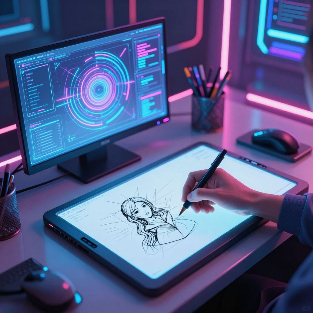 Free ai drawing concept, an imaginative futuristic workspace with AI-powered digital sketchpads and holographic brushes, vibrant color palette with electric blues and neon pinks, dynamic creative environment, high detail, cyberpunk style