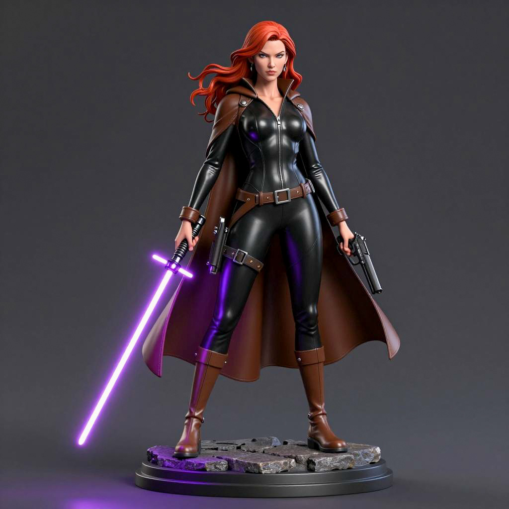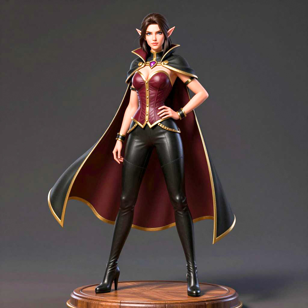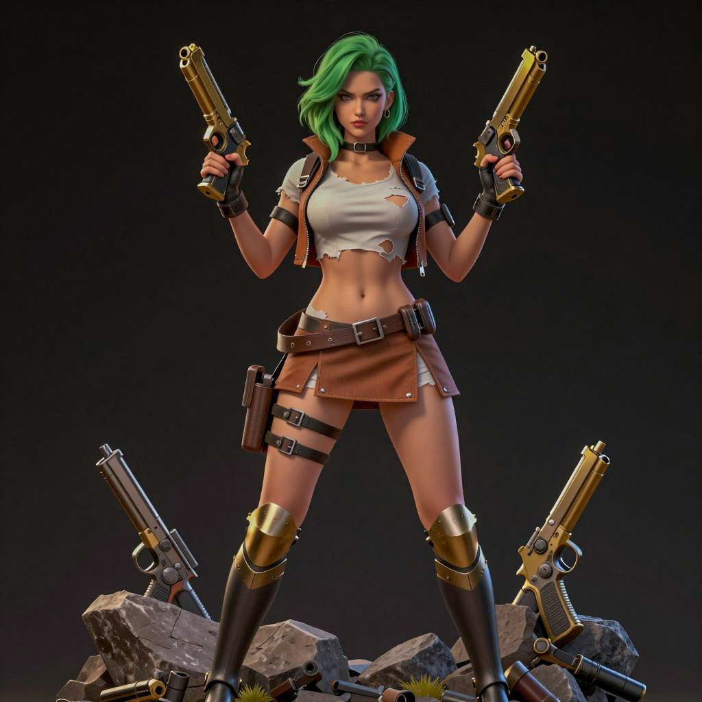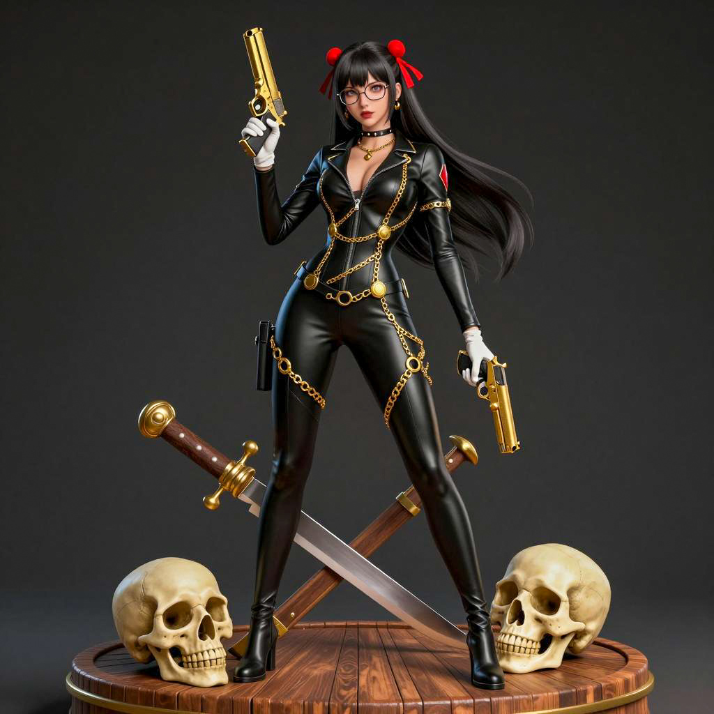 Digital illustration of a confident woman with dark hair, holding two golden revolvers in both hands. She wears a black, long, open-coat with gold accents, a low-cut, black corset revealing cleavage, white pants with brown straps, black leather boots, and a choker necklace. Her stance is strong, legs apart, standing on a round wooden base. The background is solid black.
