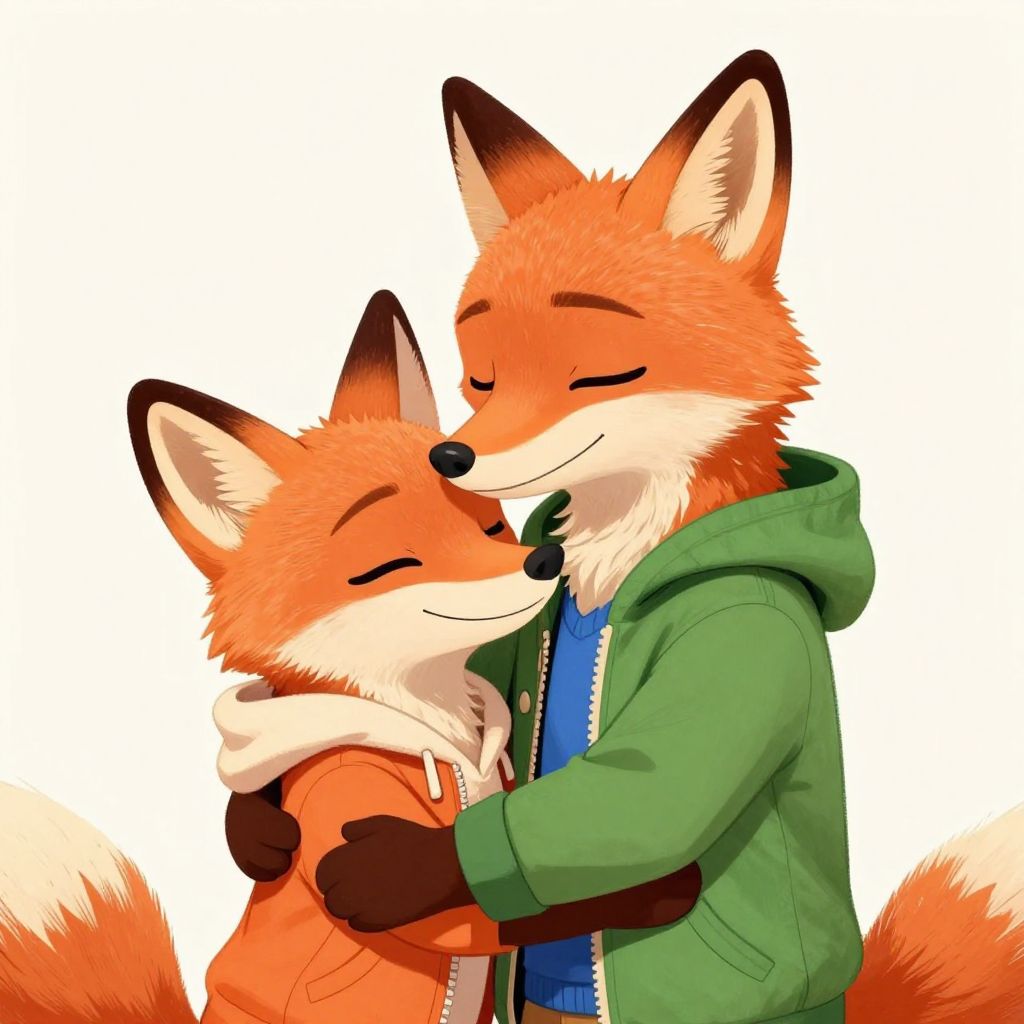 Illustration of two anthropomorphic foxes embracing each other with closed eyes, showing affection. The larger fox wears a green hooded jacket with a blue sweater underneath, while the smaller fox wears an orange jacket with a white hooded garment. Both foxes have orange fur, white facial markings, and black ear tips, depicted in a warm and friendly cartoon style.