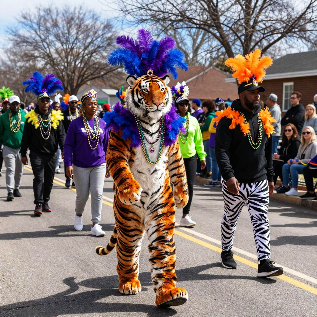 Photograph of a vibrant, colorful Mardi Gras parade. A group of people, dressed in elaborate, animal-themed costumes, walks down the street. The costumes feature bright feathers in purple, blue, and orange, along with tiger and zebra patterns. The background shows a sunny day with clear skies and bare trees. Spectators are seated on the right, watching the parade. The image has a bright, high-contrast style.